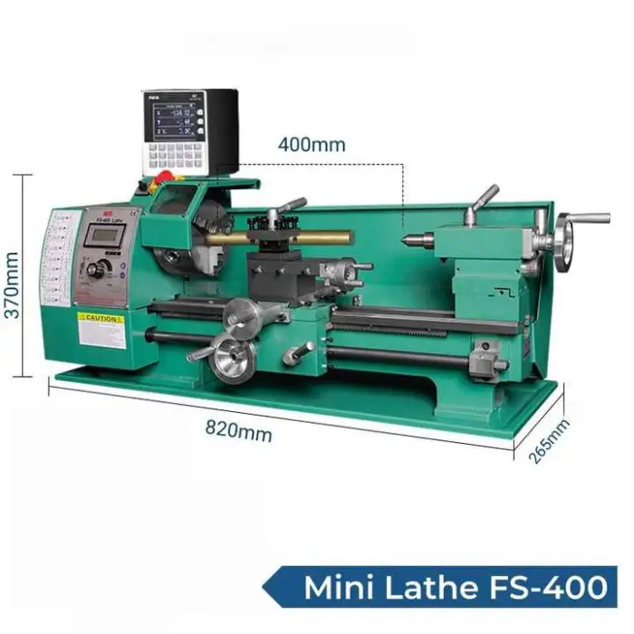 The dimensions of the lathe machine are 820 x 265 x 370 mm.