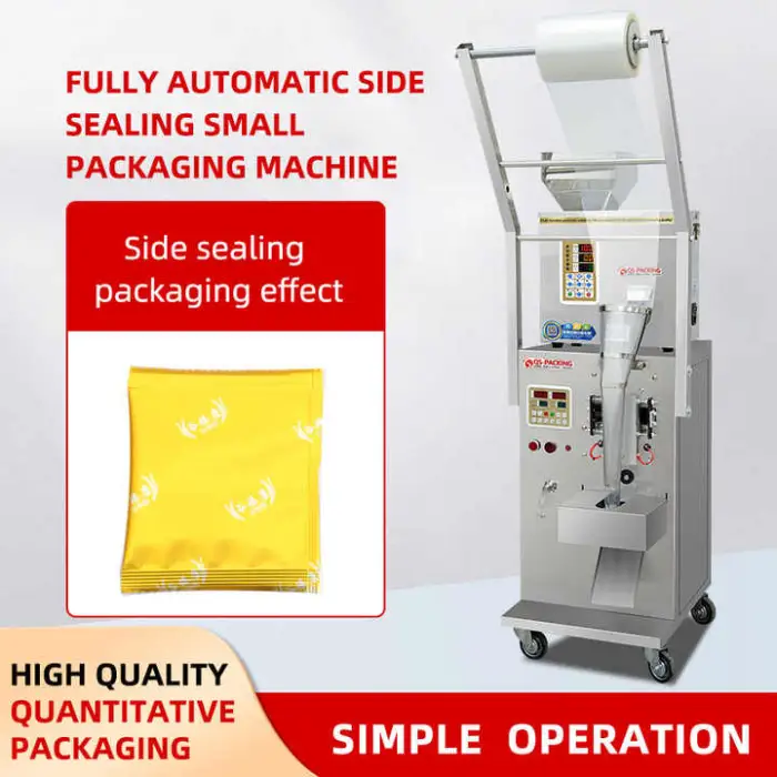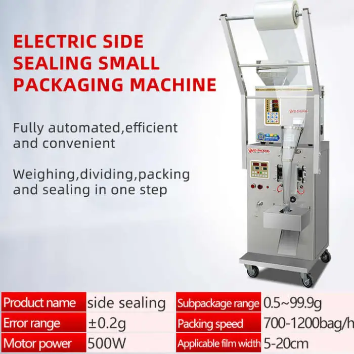 The machine can handle various materials including powders, granules, and can accommodate items like tea, sugar, and other similar products.