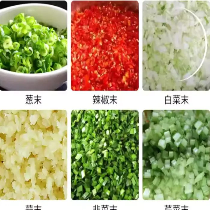 It can be supplied with 3–6 chopper blades depending on configuration and intended use; blade type and number affect cutting fineness and processing speed.