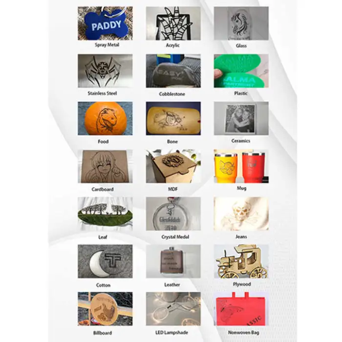 The machine can cut and engrave a variety of materials including acrylic, glass, leather, MDF, metal, paper, plastic, plywood, rubber, stone, wood, stainless steel, cobblestone, ceramics, cardboard, and billboard.