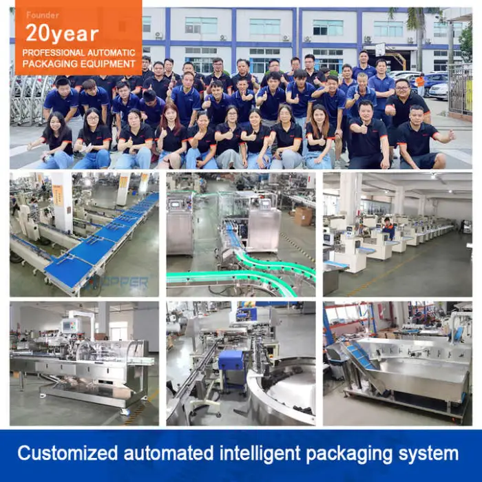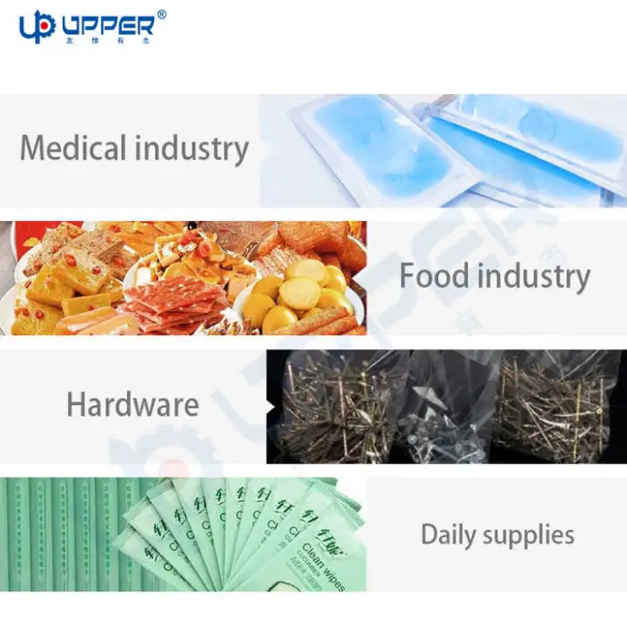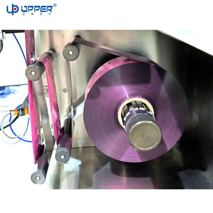 The machine supports various packaging materials including OPP/PE, OPP/CPP, and composite films.