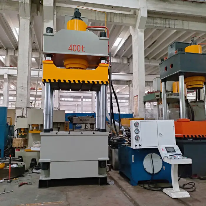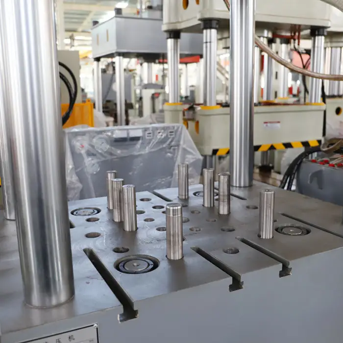The hydraulic press features a four-column design that enhances stability and accuracy during operation.