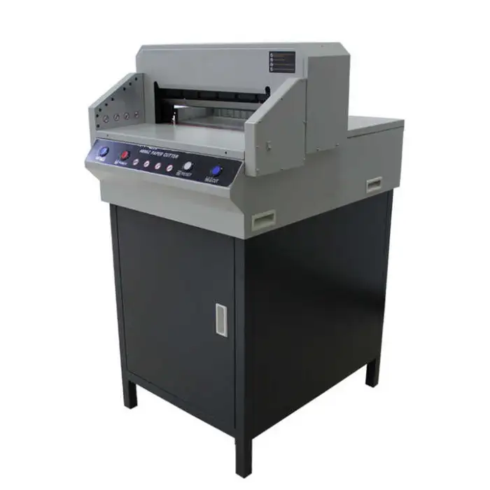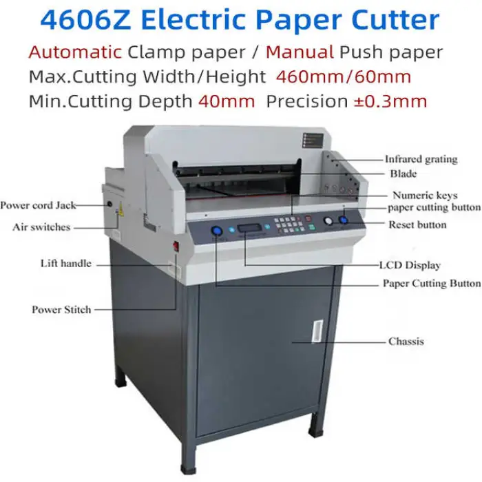 The 4606Z Semi Automatic DIY Guillotine Electric Paper Cutter can handle A3 and A4 paper sizes.