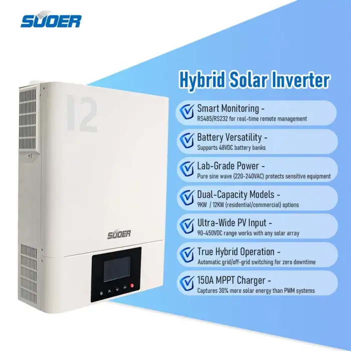 The rated output power of the MPPT Hybrid Solar Inverter is 12000W or 12000VA.