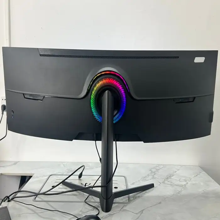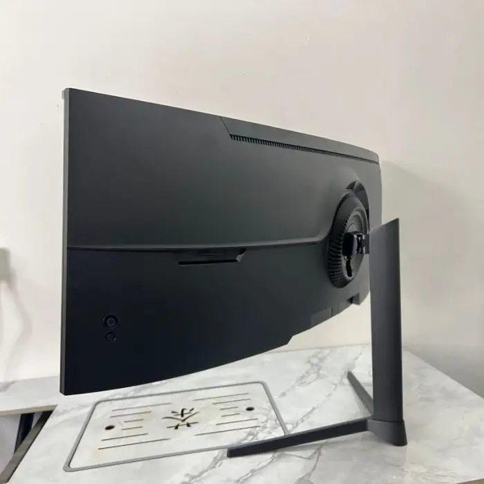The monitor has an ultra-wide aspect ratio of 32:9, providing a panoramic view that's great for multitasking and immersive gaming.
