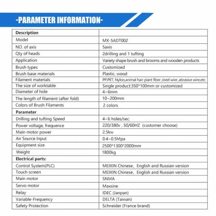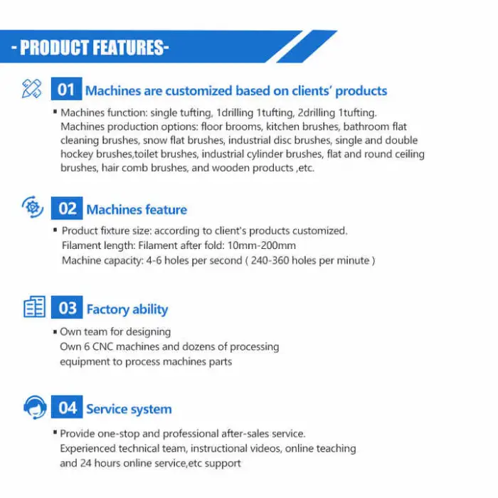 The machine has a production capacity of 4-6 holes per second, allowing for efficient manufacturing of brooms and brushes.