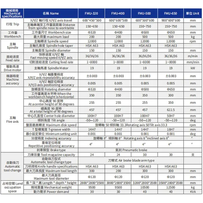 The table travel for the FMU-650 is 900 mm (X), 600 mm (Y), and 600 mm (Z).