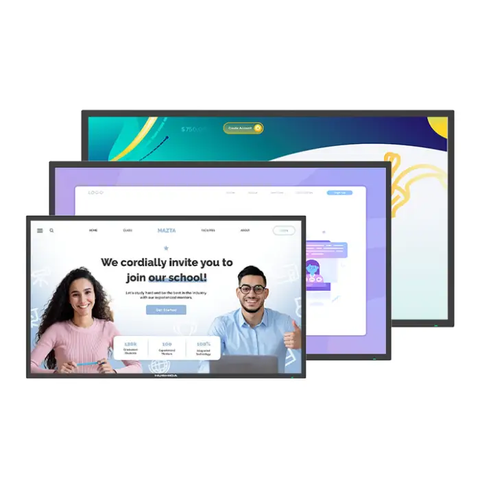 The monitor can be installed in multiple ways, including wall-mounted or floor-standing options.