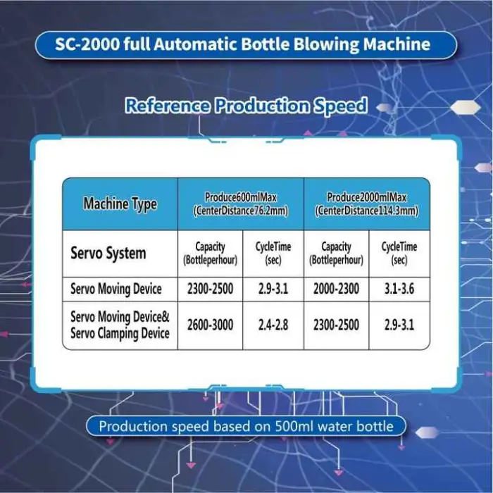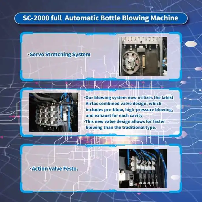 The key selling points include its high productivity, efficient 2 cavity design, and compatibility with various bottle sizes from 50ml to 2000ml.