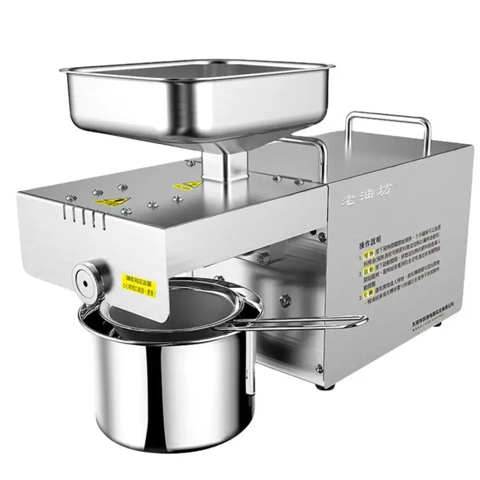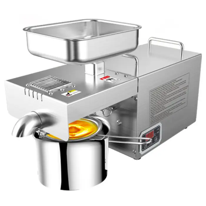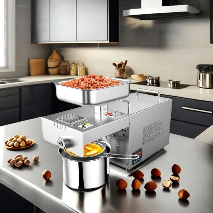 The machine has a production capacity of about 5–7 kg of raw seeds/nuts per hour. Actual throughput depends on seed type and pre-treatment (drying, dehulling, roasting).