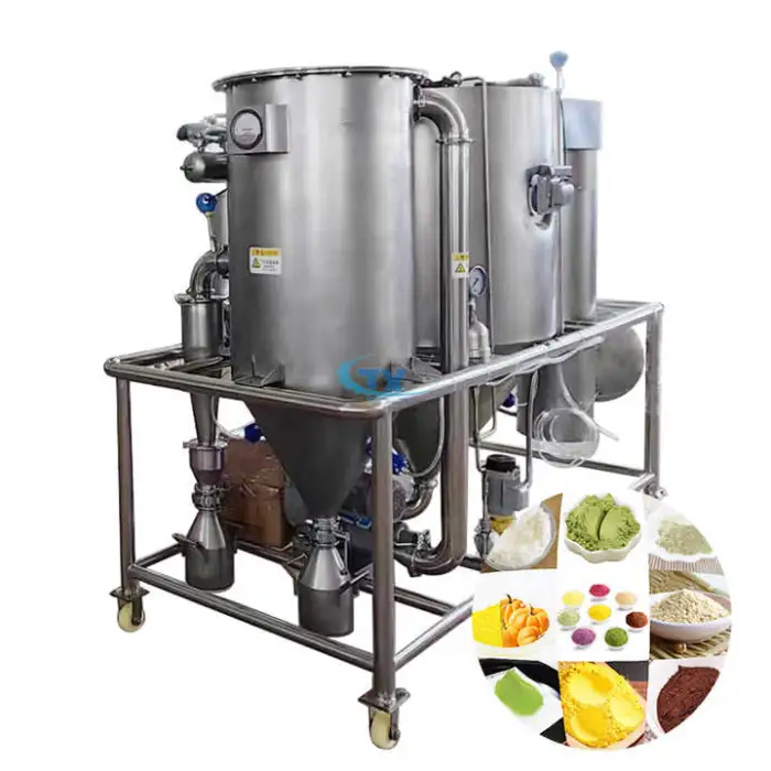 The spray dryer uses a centrifugal atomizer to transform liquid materials into solid powders or particles through a drying process.
