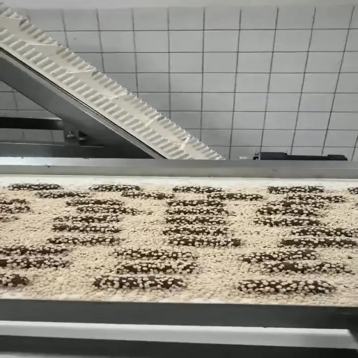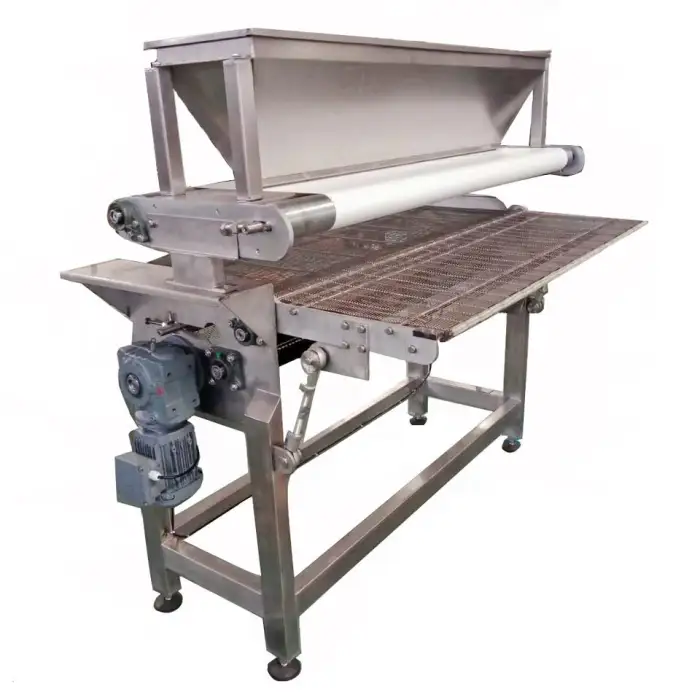 The 600mm Nuts Spread Machine is designed to efficiently sprinkle small particles like nuts over various snack products such as chocolate-coated treats, cakes, and bread.