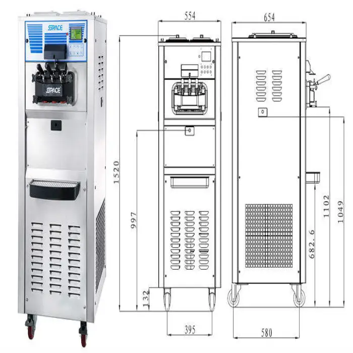 The dimensions of the 6240 Commercial Ice Cream Machine are 554 mm (L) x 654 mm (W) x 1520 mm (H).