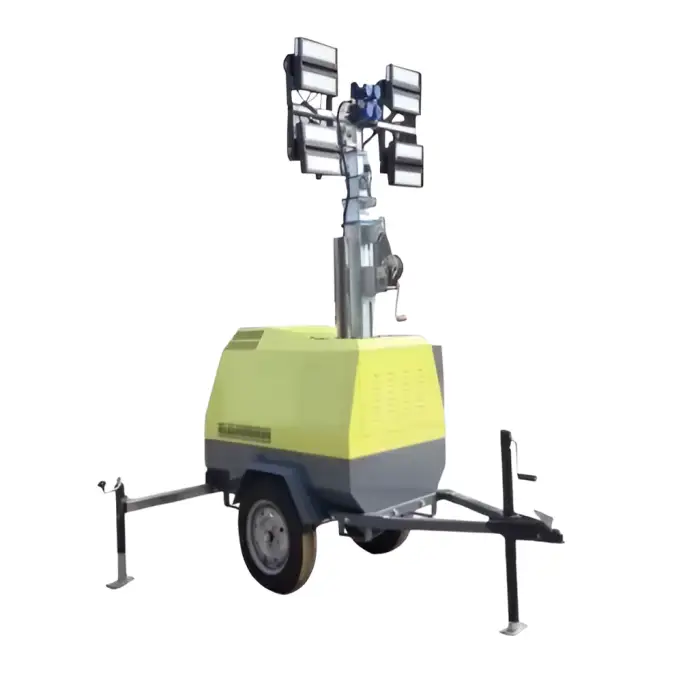 The light tower is designed with safety in mind, including stable construction and secure mounting for the lights to prevent accidents.
