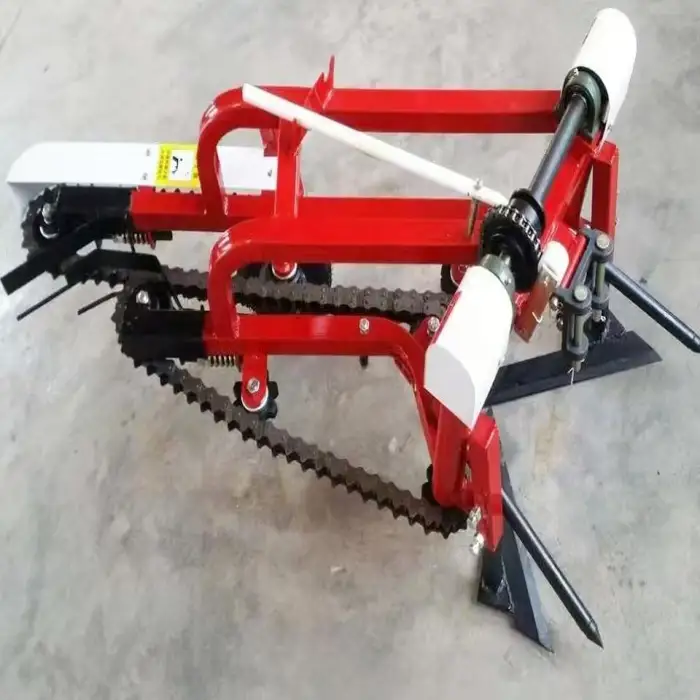 The min harvester uses a hand tractor chain transmission for hooking.