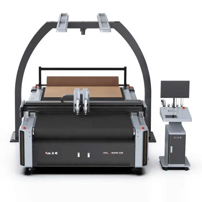 The AOL Digital Automatic Oscillating Knife CNC Cutting Machine is compatible with various materials, including cowhide, oxford cloth, PU, and sheepskin.
