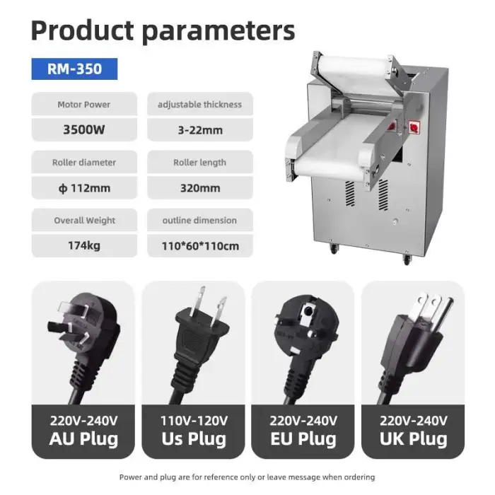 The Auto Dough Sheeter is compatible with Australian, British, European, and US plug types.
