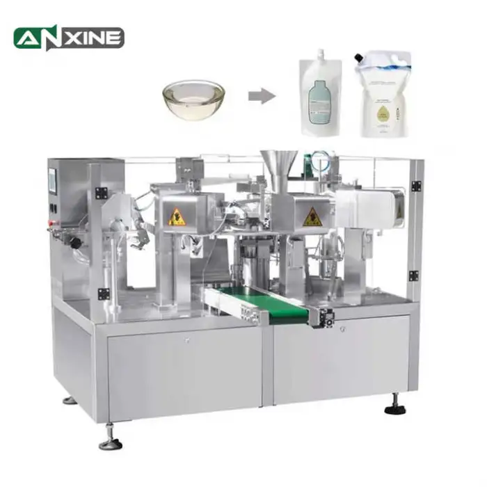 The Auto Servo-Driven Rotary Premade Slant Spout Bag Filling Packaging Machine is suitable for filling hand soap, dishwashing liquid, laundry detergent, and other food, commodity, and chemical products.