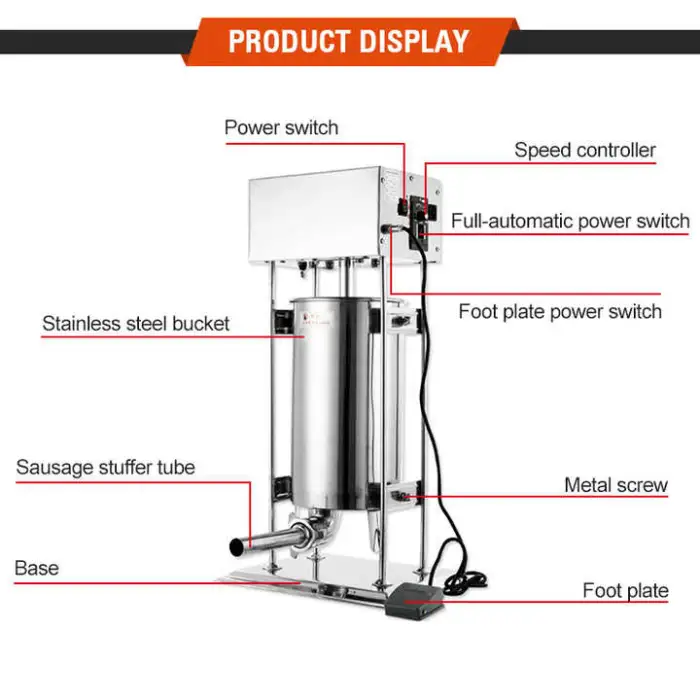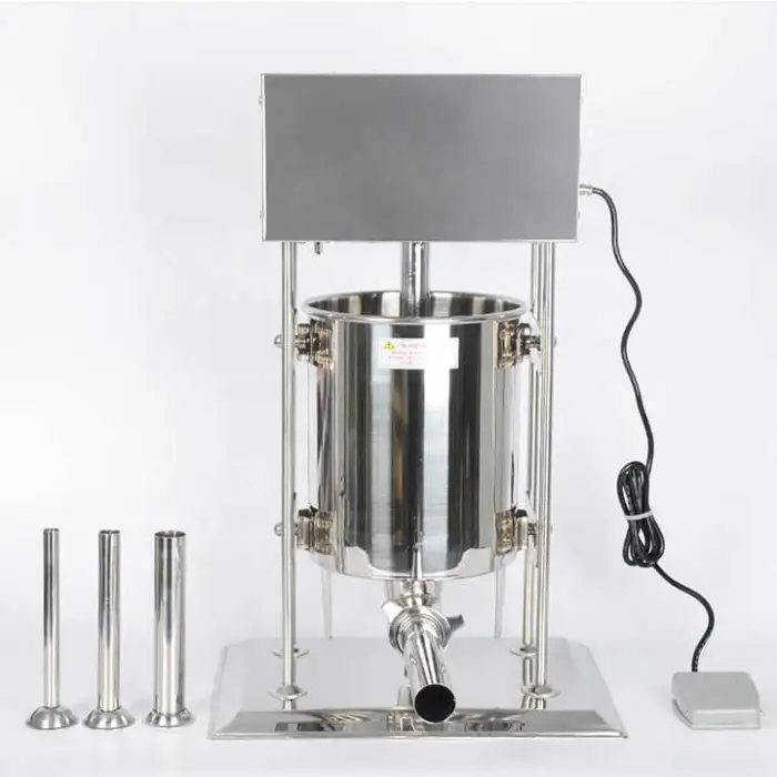 The machine has a production capacity of 10-30 liters, making it efficient for high-volume sausage filling.