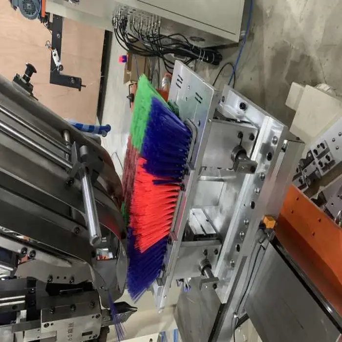 The machine supports adjustable filament lengths (10–200 mm) and automatic tuft placement, and comes with a mold fixture for brush bases. For custom tuft patterns or custom mold tooling, consult the manufacturer about options and tooling costs.