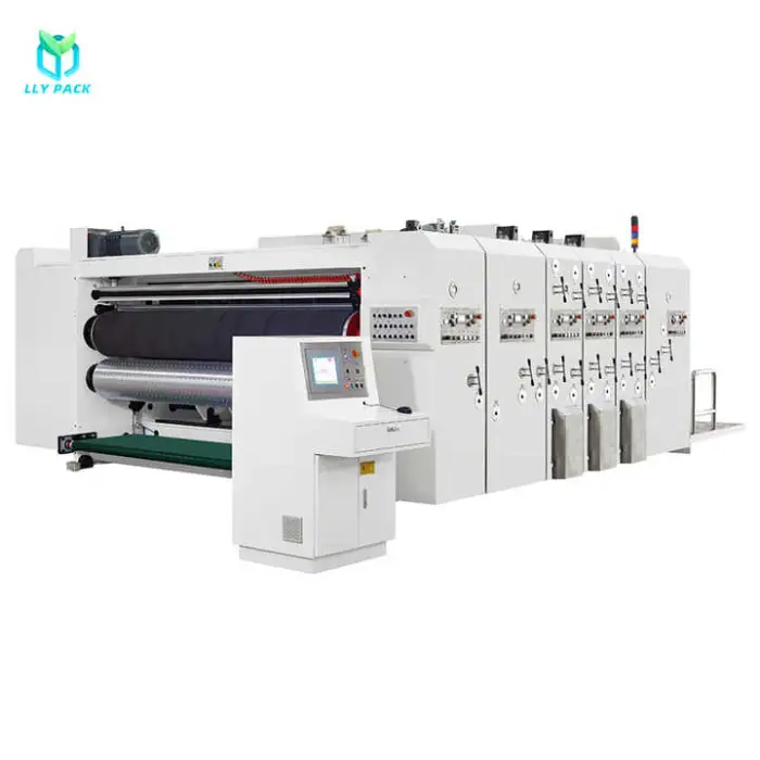 The machine is used for manufacturing corrugated cardboard boxes, producing custom cartons, high-volume printing, and precise slotting and die-cutting.