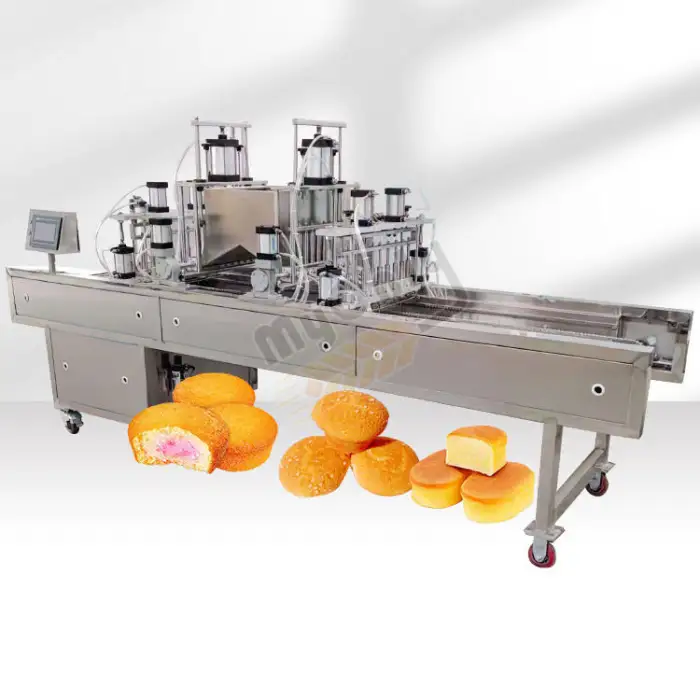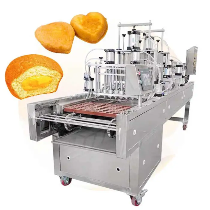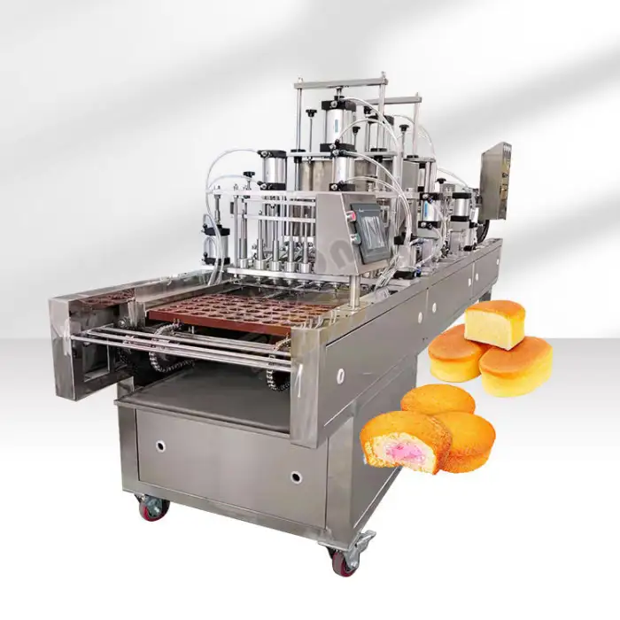 The machine is designed for cake paste forming and cream filling, allowing bakeries and pastry shops to create cakes efficiently.