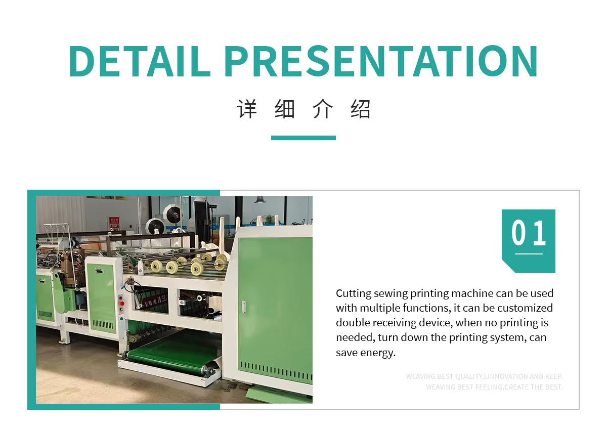 The machine is designed to manufacture PP woven bags, plastic bags, and can accommodate custom printing on bags for various applications.