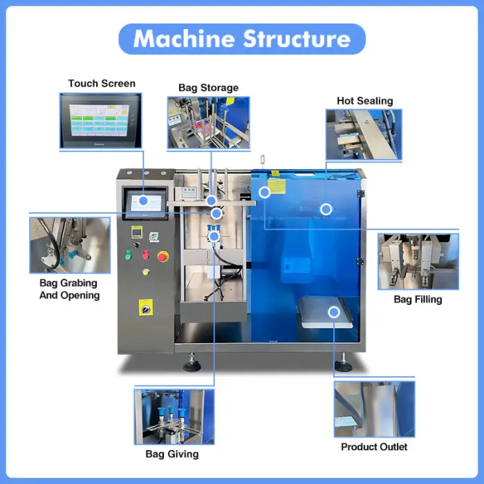 The machine can use premade bags, doy bags, 3 sides sealing bags, and irregular bags.