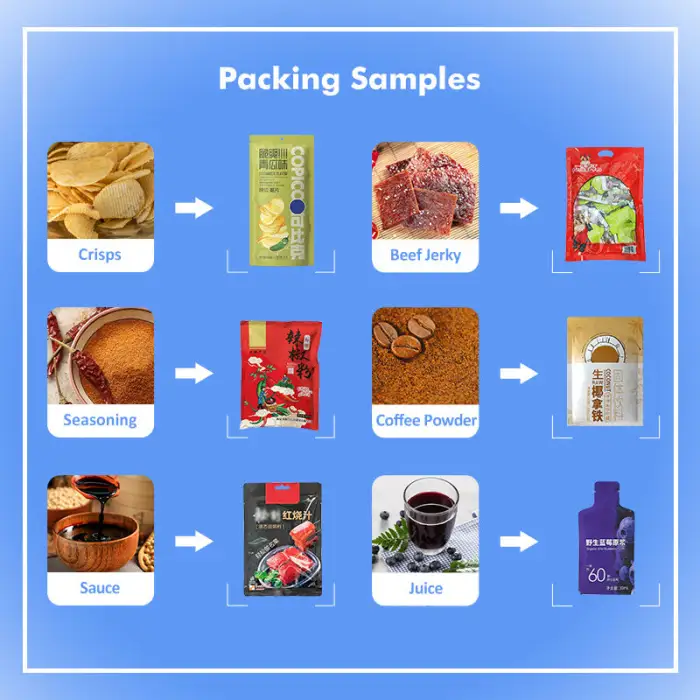 Industries such as food and beverage, snacks, chemicals, textiles, and hardware can benefit from this machine.