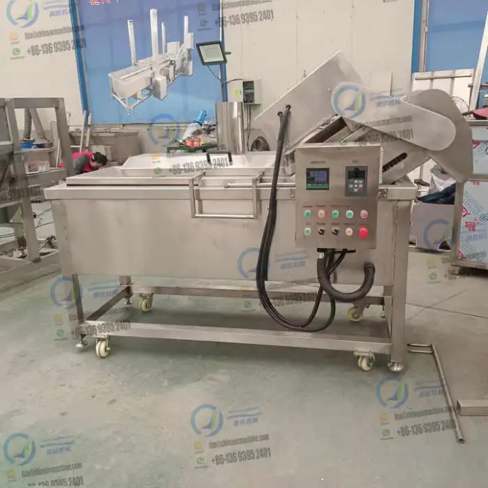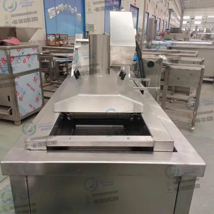 The main function of the machine is to fry various types of food quickly and efficiently using a continuous mesh belt.
