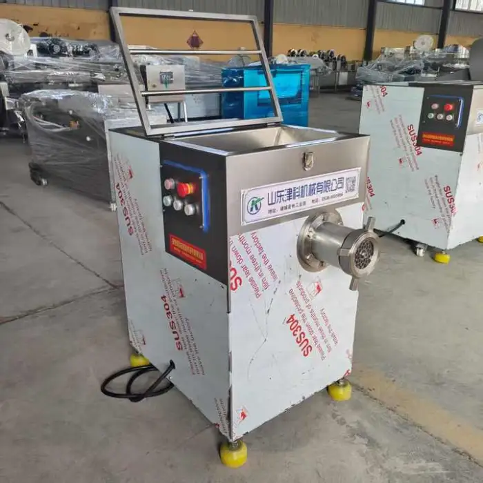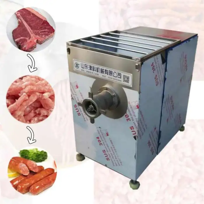 Always disconnect power before maintenance, never reach into the feed throat while running, use the provided pusher to feed meat, ensure the machine is properly grounded, and provide operator training. Confirm presence of emergency stop or interlock features with your supplier.