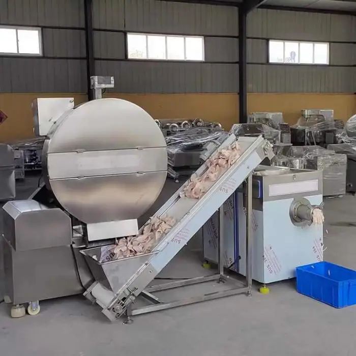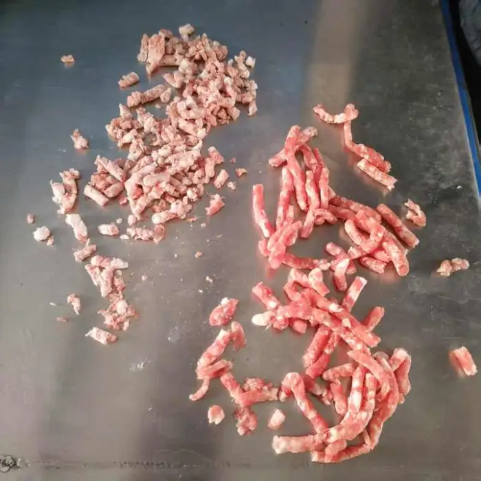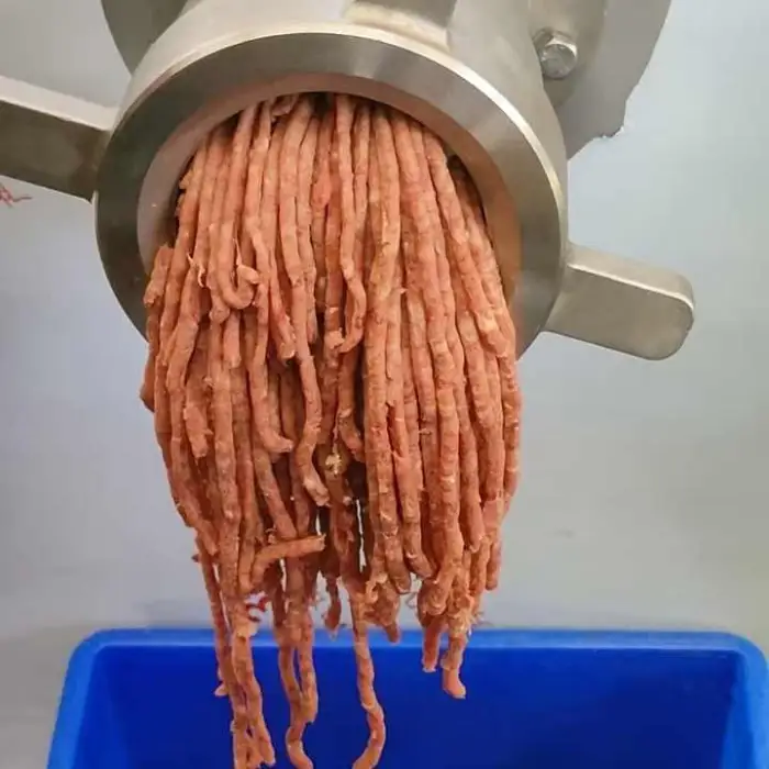 Yes — the machine is designed for frozen meat processing and can handle frozen blocks and pieces. For best results, use appropriately sized pieces that fit the feed hopper and follow the manufacturer's guidance on feed size and temperature.
