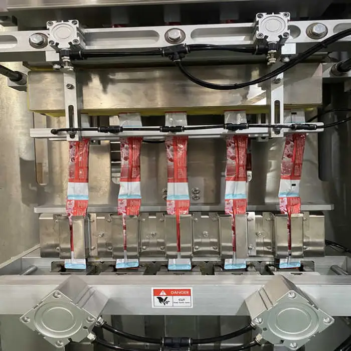 The machine is designed to fill and seal various types of food and beverage products, including thick sauces, pastes, and liquid food products.