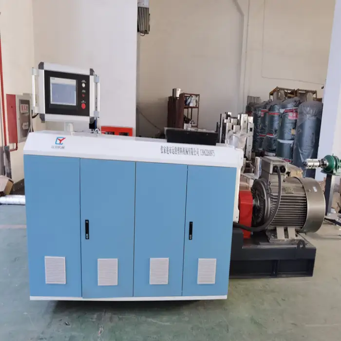 The machine features a single-screw design, which is known for its high efficiency in the extrusion process.