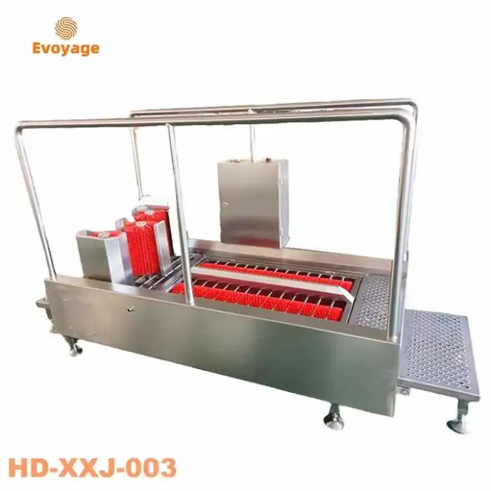 Regular maintenance typically includes checking and refilling disinfectant, inspecting and cleaning brushes, clearing strainers/filters, draining and cleaning wastewater traps, and periodic inspection/replacement of wear parts. Follow the supplier’s maintenance schedule and keep a log of service activities.