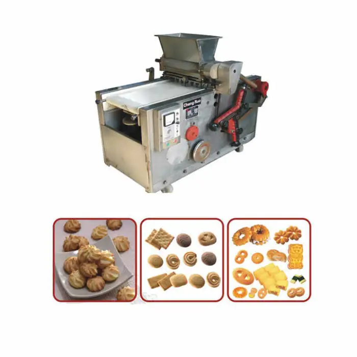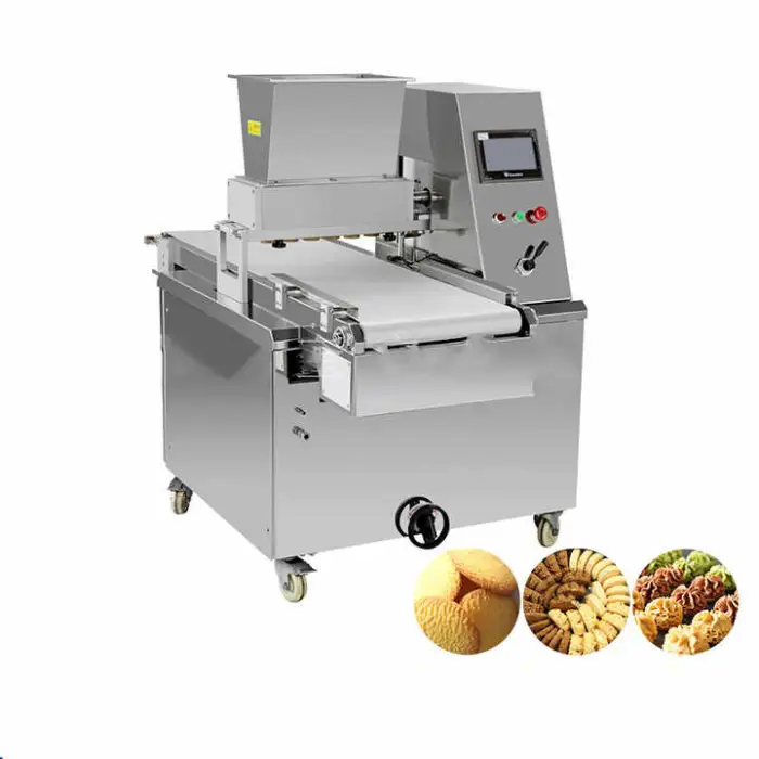 The machine is designed for high output, allowing bakeries and factories to produce large volumes of cookies and biscuits quickly.