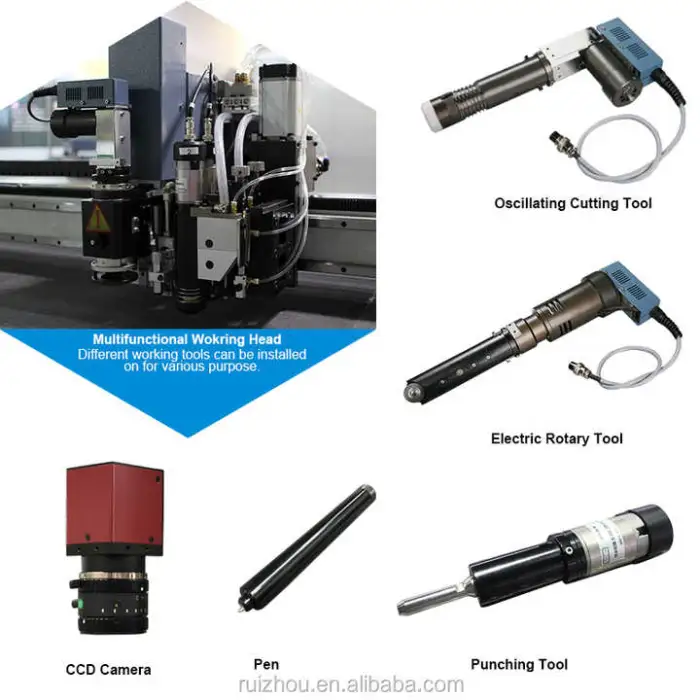 The machine uses vibrating blades and pen types of knives, allowing for versatility in cutting applications.