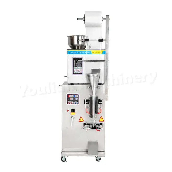 This machine is designed to package a variety of food items including tea bags, granules, small snacks, and even tobacco products.