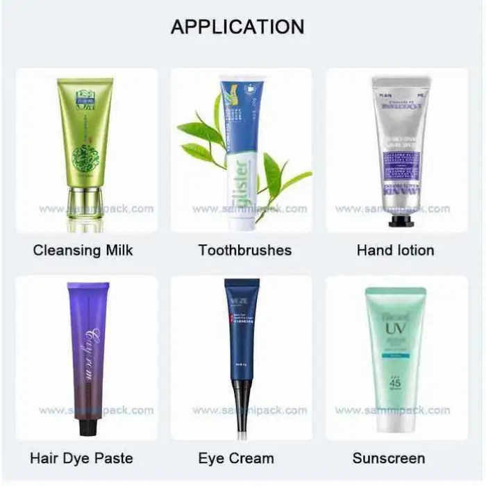 The machine is designed for filling and sealing various types of products, including cosmetic items like lip gloss and creams, food items such as sauces and pastes, beverages including milk and water, and various liquids in chemical and medical fields.