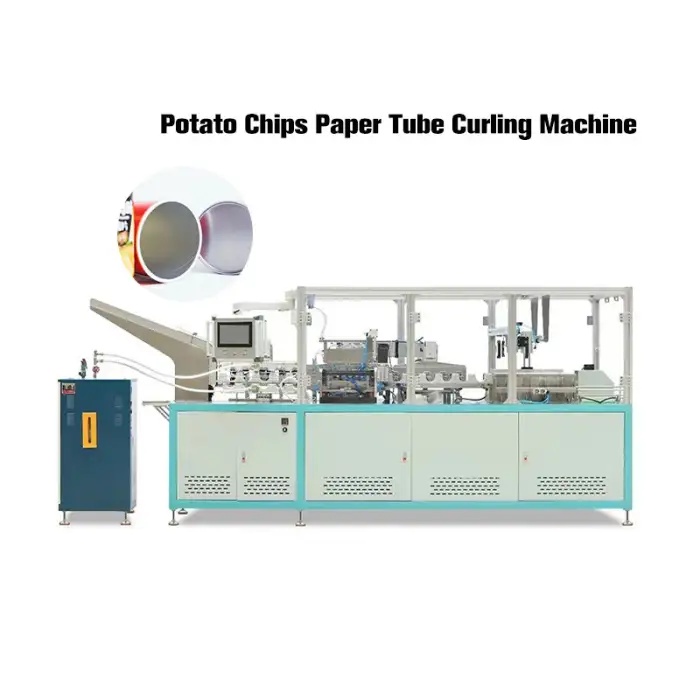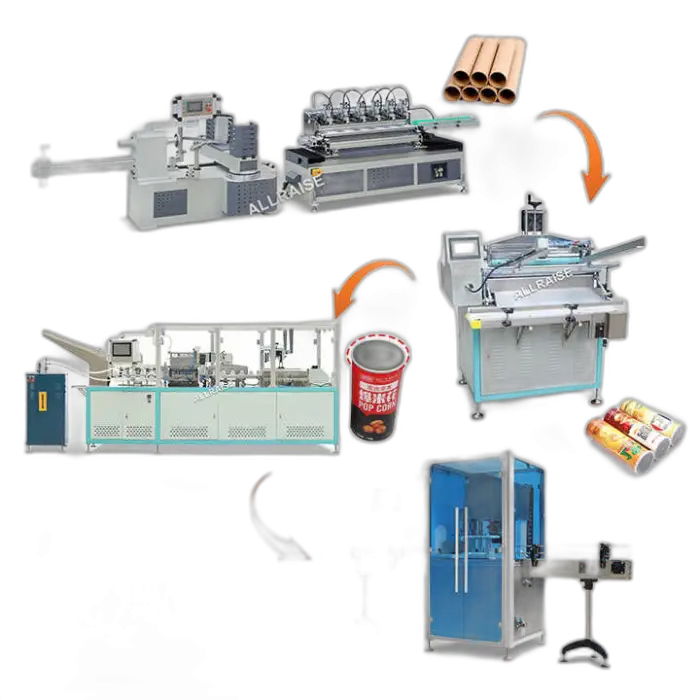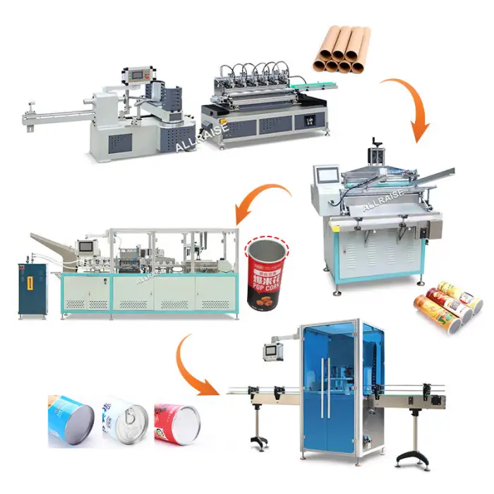 This machine enhances production lines in the food packaging industry by automating the process of creating sturdy and attractive paper cans.