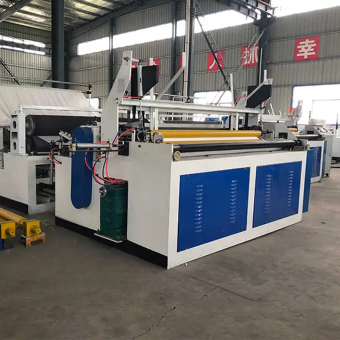 Output depends on roll length, width and core size. The machine runs up to 200 m/min web speed — calculate finished rolls per hour by dividing total linear meters produced per hour by the paper length per roll. Consult the supplier with your roll specs for precise yield estimates.