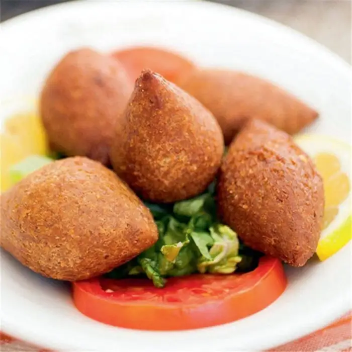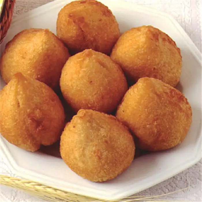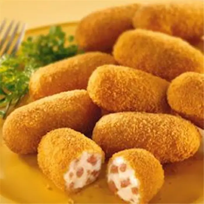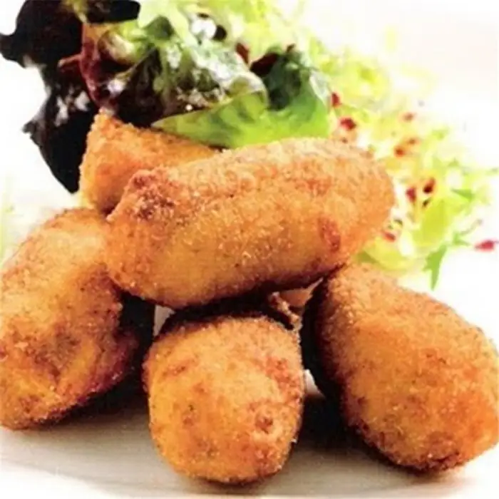 The machine is designed to produce a variety of snacks including croquetas, coxinhas, kubbas, and cheese balls.