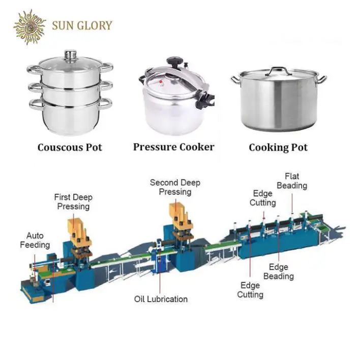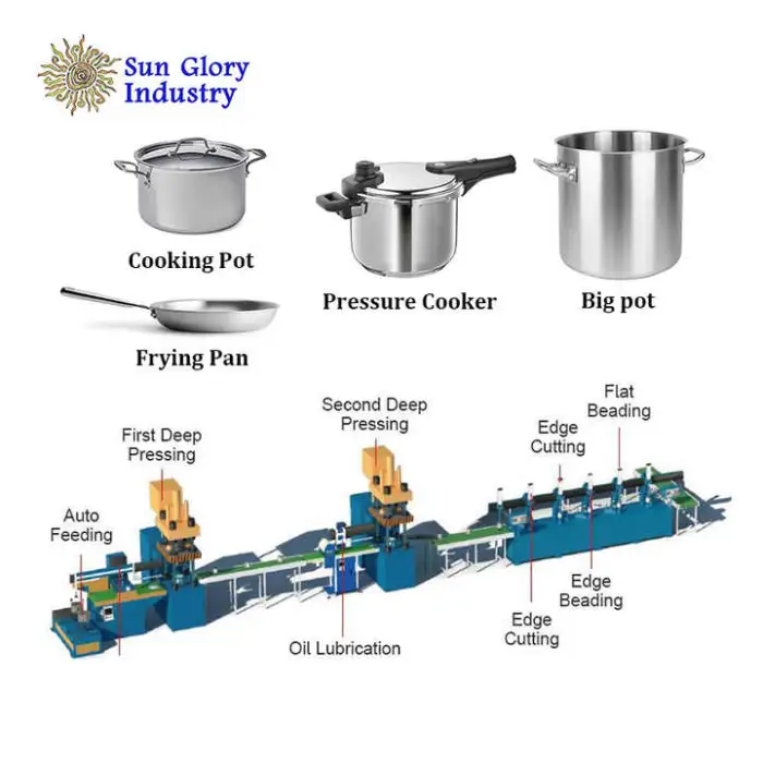 This production line can be used for manufacturing stainless steel cookware and producing aluminum pots and pans.