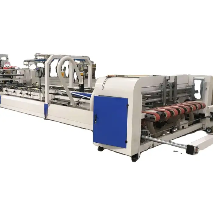 The main functions include automatic folding, gluing, and stitching of corrugated carton boxes.