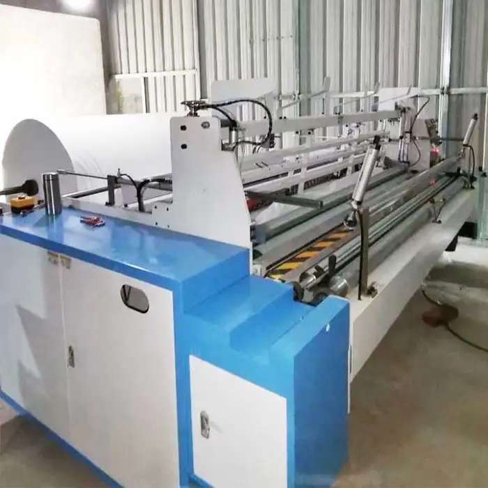 It converts jumbo reel paper into small toilet tissue rolls, performing slitting, embossing (if configured), rewinding, cutting and packing at high speed for finished toilet paper products.