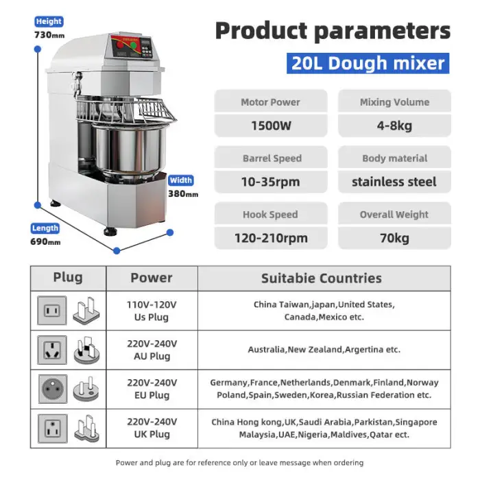 The mixer is available in two voltage options: 220V and 380V.