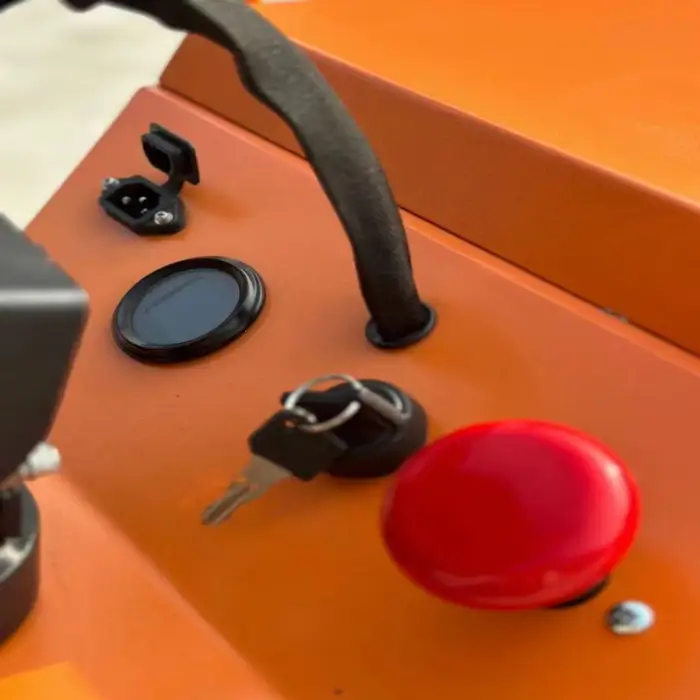 The tractor is battery operated for easy use, offers high efficiency and performance, and has electronic steering for smooth maneuvering.