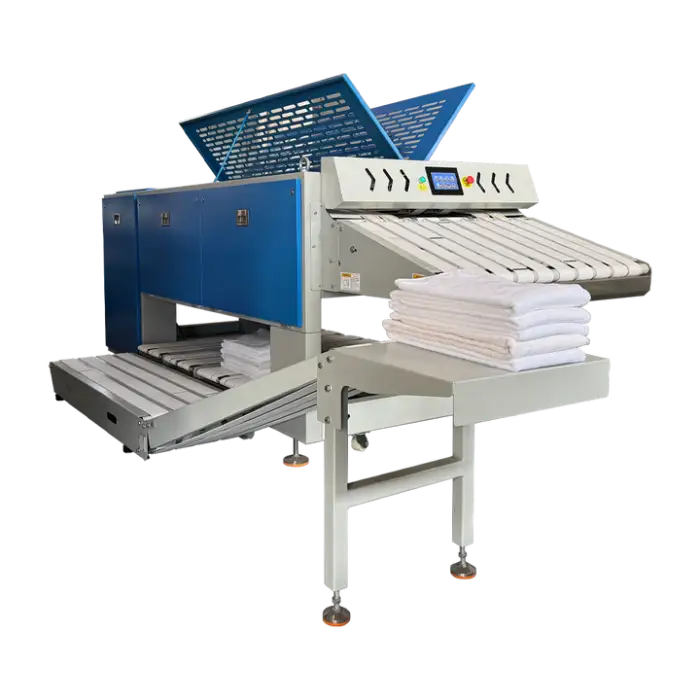Commercial ironing/folding machines normally include emergency stop(s), guarded moving parts and clear operator controls. Operators should receive training on safe operation, lockout/tagout, and routine troubleshooting. Confirm specific safety features and available training from the vendor.