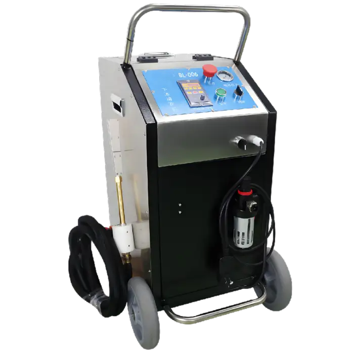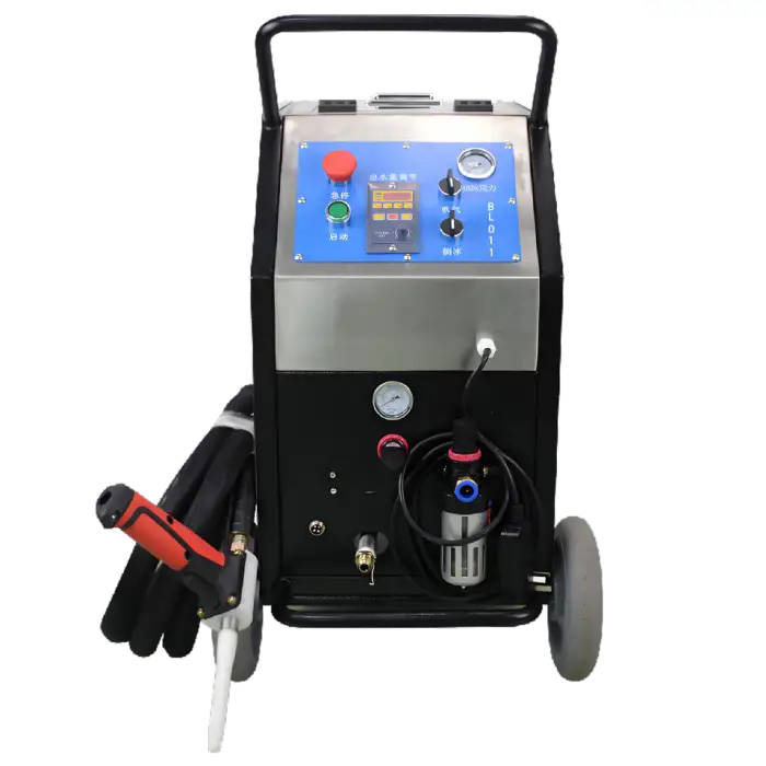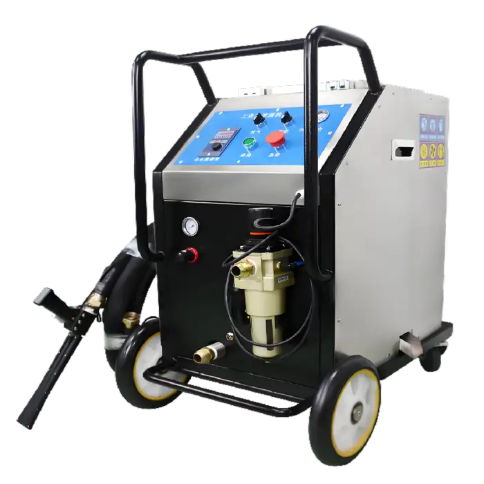 The machine uses dry ice pellets that are blasted at high pressure onto surfaces. Upon impact, the dry ice sublimates, lifting dirt, grease, and contaminants away without the need for water or harsh chemicals.