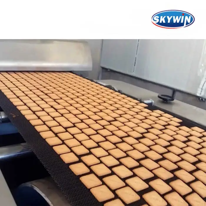 This machine can produce various types of biscuits, including soft, hard, soda, and sandwich biscuits.